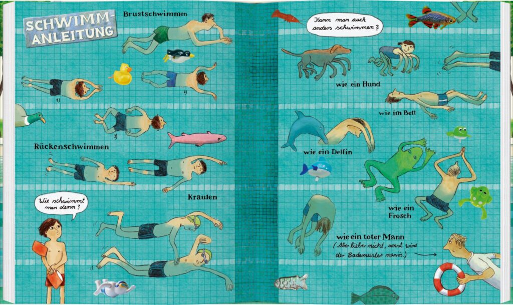 Dieses kunterbunte Buch erzählt fast alles über Schwimmer*innen und Nichtschwimmer*innen, Turmspringer*innen und Nichtspringer*innen, Bademeister*innen und Schwimmmeister*innen. Es geht um Pommes-Frites-Hunger, erste Schwimmversuche, Mutproben und Abzeichen – echte und erfundene! Ob drinnen oder draußen, hier steckt alles drin, was Spaß macht. Die Künstlerin Eilika Mühlenberg hat das Buch liebevoll mit Collagen, Fotos, Zeichnungen, Comics und Wimmelbildern […]